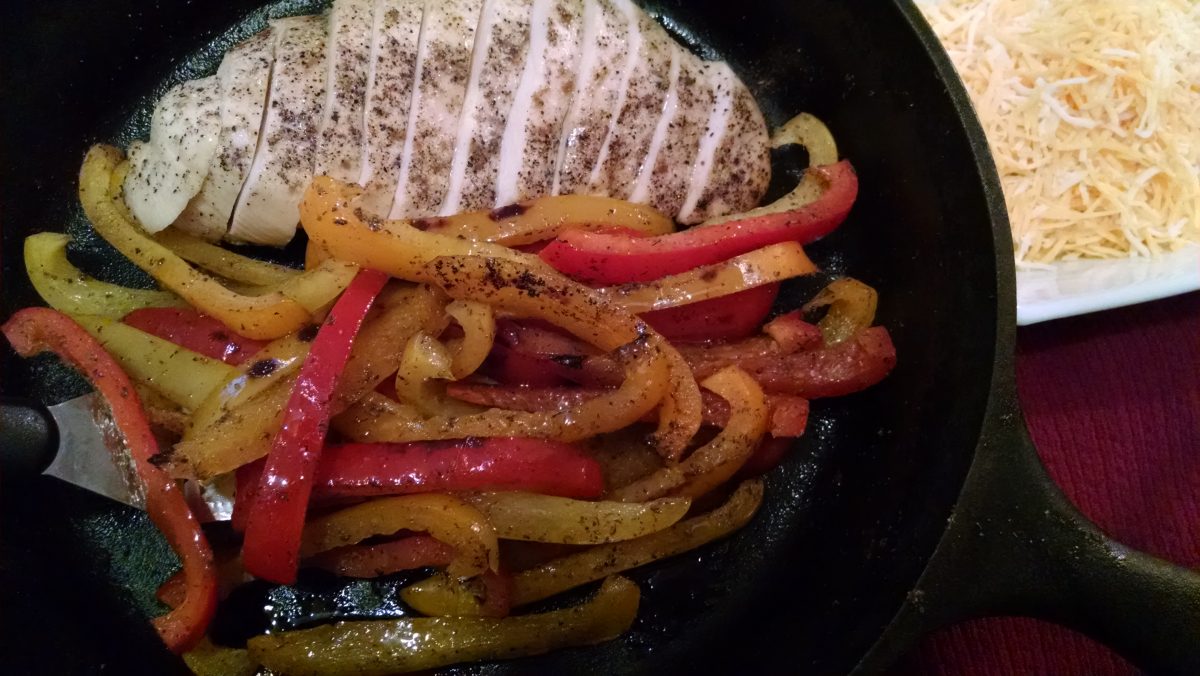 For fajita veggies, I saute them in a cast iron skillet over medium high heat for about five minutes, in a combination of coconut oil and olive oil. (I know, I know, olive oil breaks down at high heat. I just don’t care for the coconut oil flavor in savory dishes. You choose the oil that best suits you.)