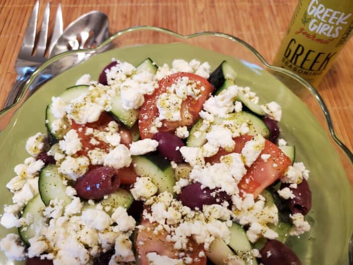 - In a separate small bowl blend the olive oil, lemon juice and Greek Girls Seasoning; pour over the salad.